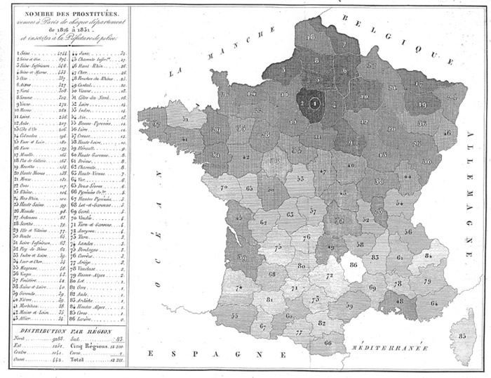 Avec l’émergence de la cartographie statistique, se développent de nouvelles formes de représentations. Les cartes servent à visualiser des données (liées aux populations) sur un territoire déterminé. La première carte démographique apparaît en Prusse en 1828. La première carte statistique moderne – sur l’instruction populaire en France – est présentée deux ans plus tôt, en France, par Charles Dupin (ci-dessous, une des premières cartes choroplèthes dont il est l’auteur). De 1845 à 1870, l’ingénieur français Charles Joseph Minard réalise une série de cartes figuratives dans lesquelles il s’essaie à l’adaptation de nombreux procédés graphiques. Les codes de la cartographie statistiques quantitative comprennent les cartes choroplèthes (cartes thématiques sur lesquelles les régions apparaissent en couleur), les cartes par points, les cartes isoplèthes (zones séparées par des lignes et points) et les cartogrammes.