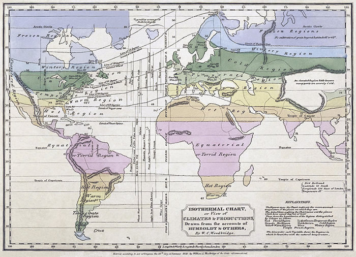 La première carte climatique est présentée en 1817 par le naturaliste allemand Alexander von Humboldt. Il utilise des courbes isothermes pour indiquer les variations de température.