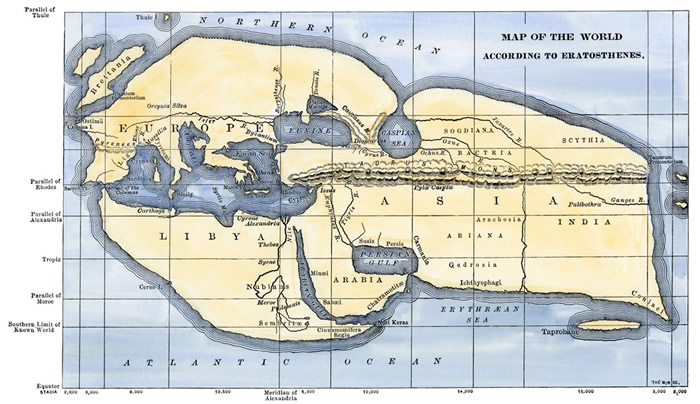 Le philosophe, mathématicien, poète et astronome grec Eratosthène de Cyrène établit « une carte du monde connu ».