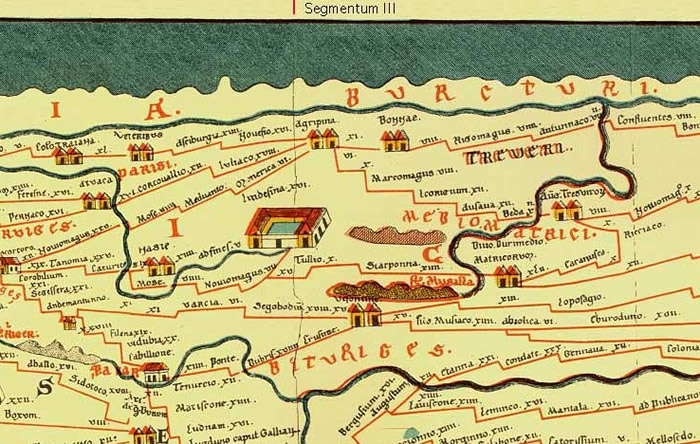 Les empereurs romains établissent des cartes, qui consistent en des itinéraires routiers de l’empire à l’usage des armées. Ci-contre, la Table de Peutinger (ou carte de Castorius), redécouverte en 1494, qui constitue une copie d’une carte romaine. Cette carte mesure 6 mètres de long et 30 cm de large.