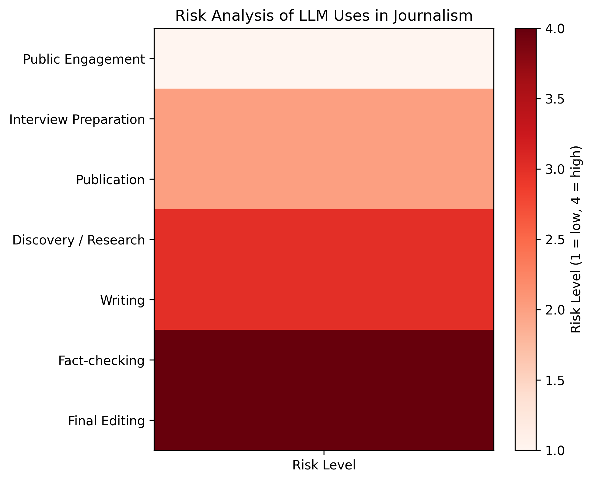 | Story discovery and preliminary research | Moderate to high | – Critical verification of information – Cross-checking and diversifying sources – Treat AI as a starting point |